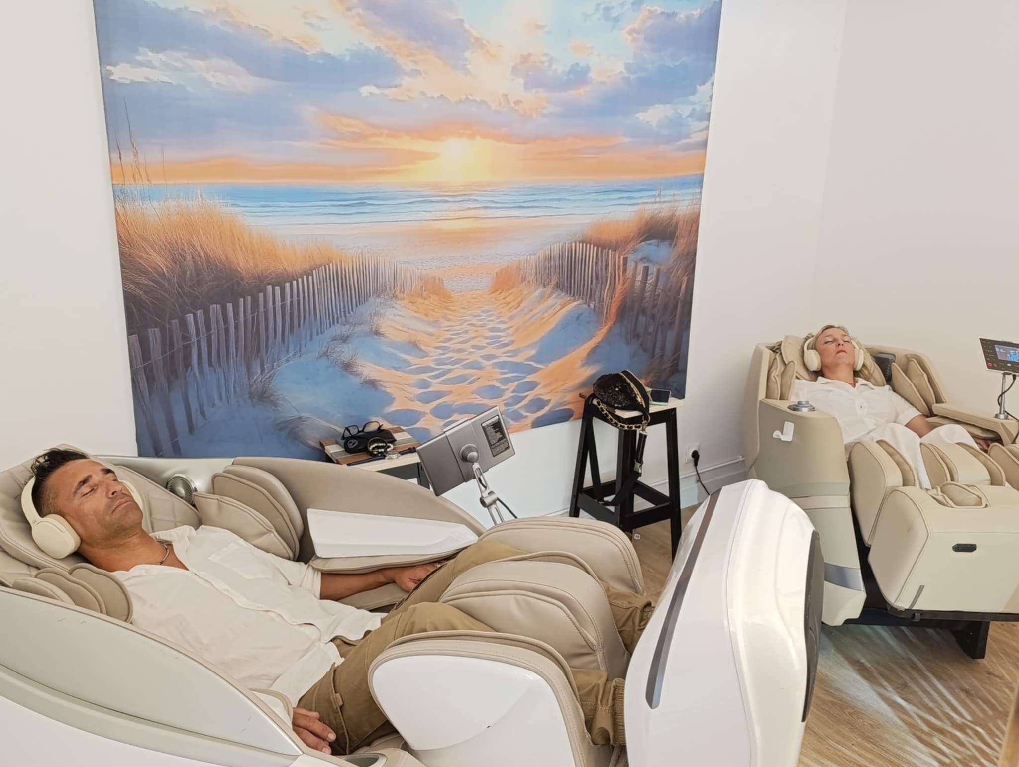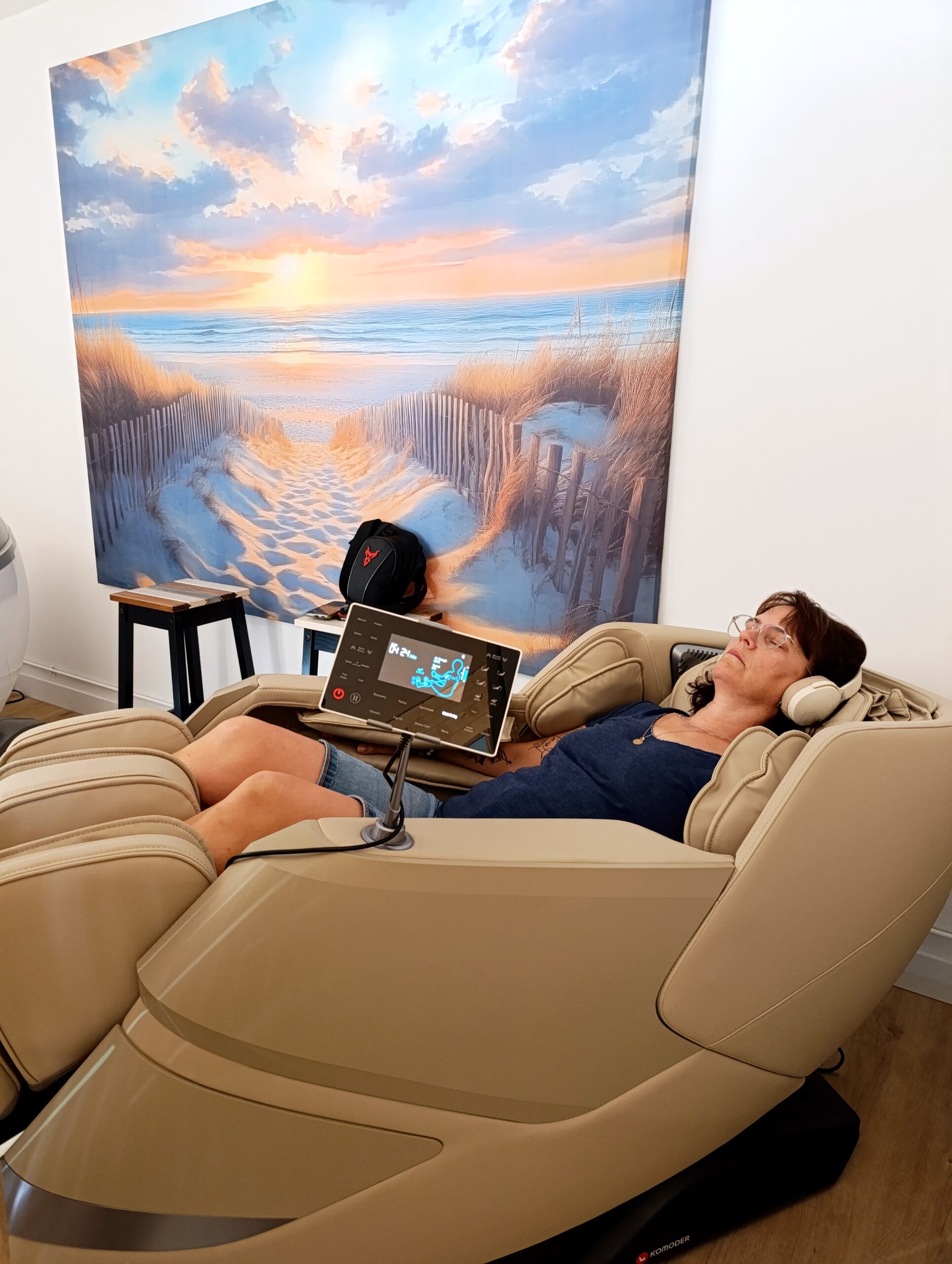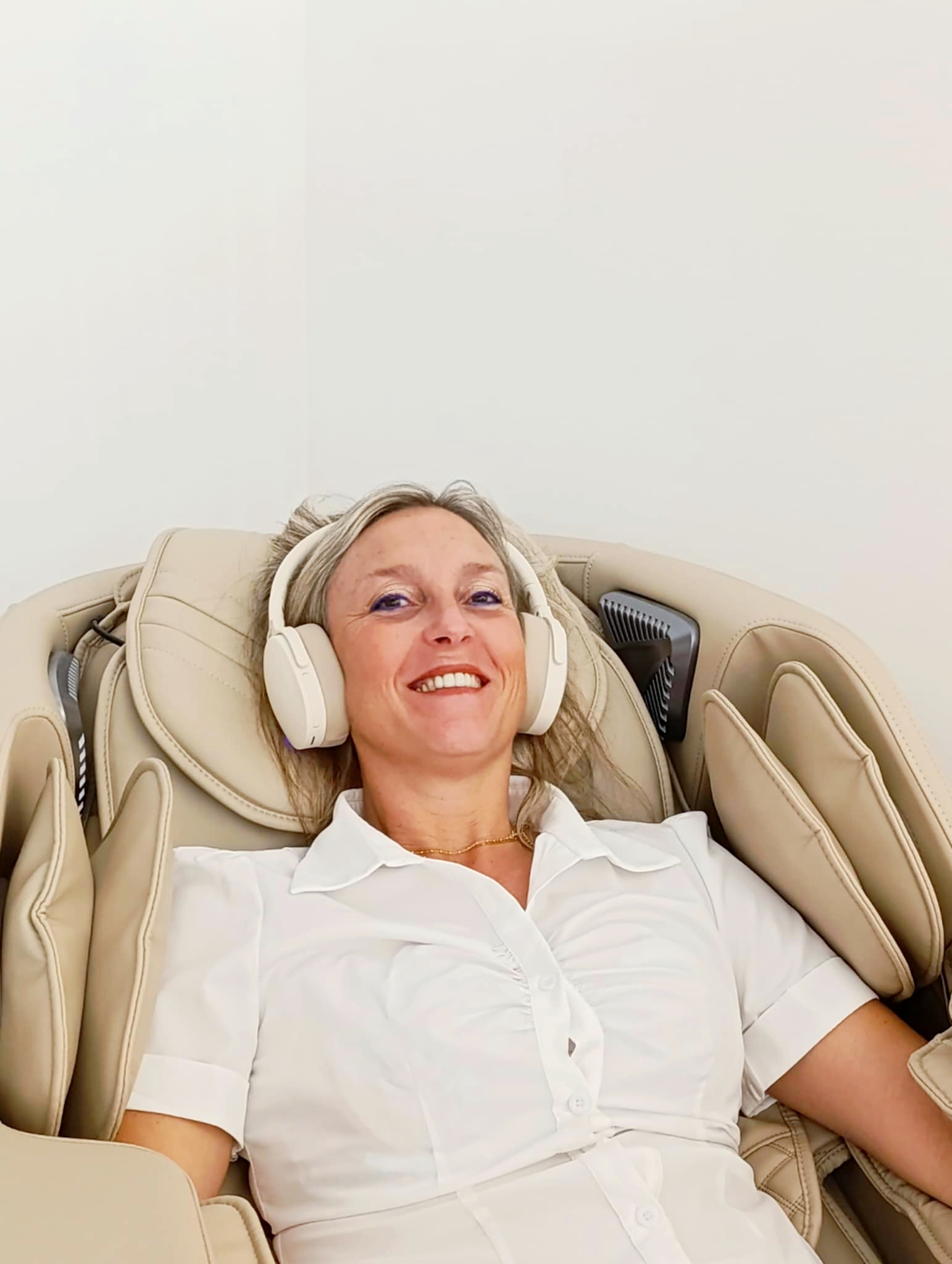 Installés confortablement dans le fauteuil, après retrait uniquement des chaussures, vous êtes comme sur un nuage, dans un espace apaisant, propice au lâcher prise.